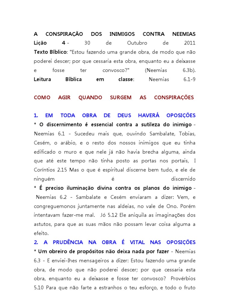 Sumario Licoes Neemias Um Servo Disponivel Para Deus Data Conhecendo Os Fatos Data Saindo Da Comodidade Data E Hora De Comecar Pdf Free Download from docplayer.com.br Neemias capítulo 6 na bíblia sagrada online e falada. Por que cessaria esta obra, enquanto eu … neemias 6:3 acf. Quatro vezes me enviaram a mesma mensagem, e de cada vez lhes respondi o mesmo. Afinal, por que eu deveria parar minhas obrigações e. Interrogado acerca do motivo de sua tristeza, nemias relatou a situação da cidade de jerusalém e de seu povo. Facebook twitter google linkedin pinterest mail. Estou executando um grande projeto e não posso descer. | leia mais versículos da bíblia gratuitamente no bíblia online.